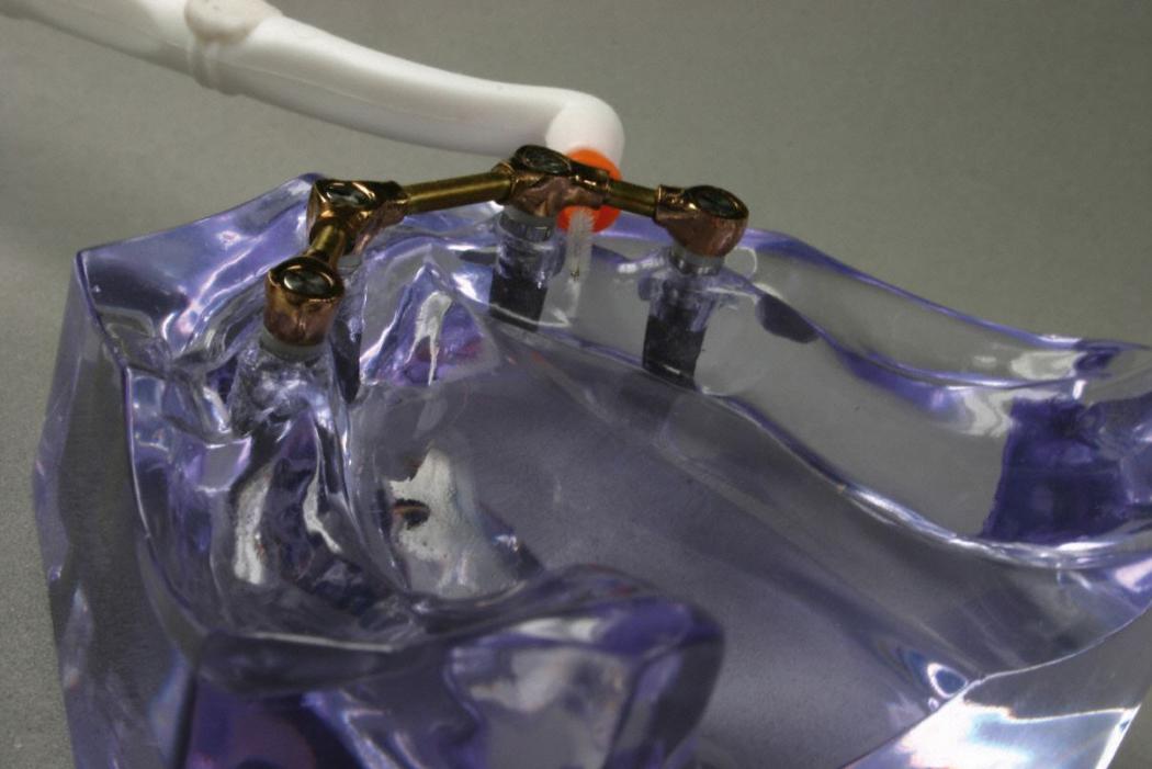 Implantatgestützter Zahnersatz muss genau wie die eigenen Zähne gepflegt werden. Hierbei sollte nach Eingliederung des Zahnersatzes eine spezielle Einweisung zur Pflege des Zahnersatzes durch das Prophylaxeteam erfolgen.