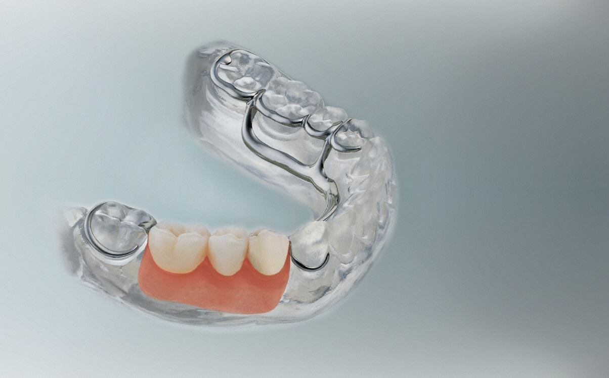 Fehlen mehrere Zähne im Kiefer, besteht auch die Möglichkeit eines herausnehmbaren Zahnersatzes. Er wird mit Hilfe von Verbindungselementen wie Teleskopkronen, Klammern oder Stegen eingesetzt.